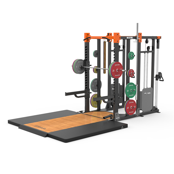 功能区:杠铃片整组挂架、万向炮筒、举重杆保护架、单杠架、双杠架、大飞鸟功能
